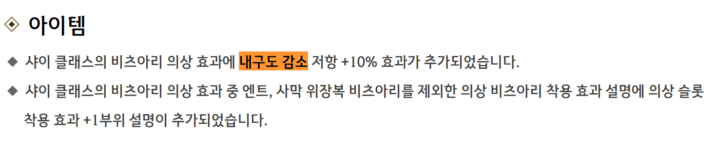 2025.07.30 업데이트로 인해서 샤이 모험가분들도 내구도 감소 저항 91% 달성 할 수 있습니다.